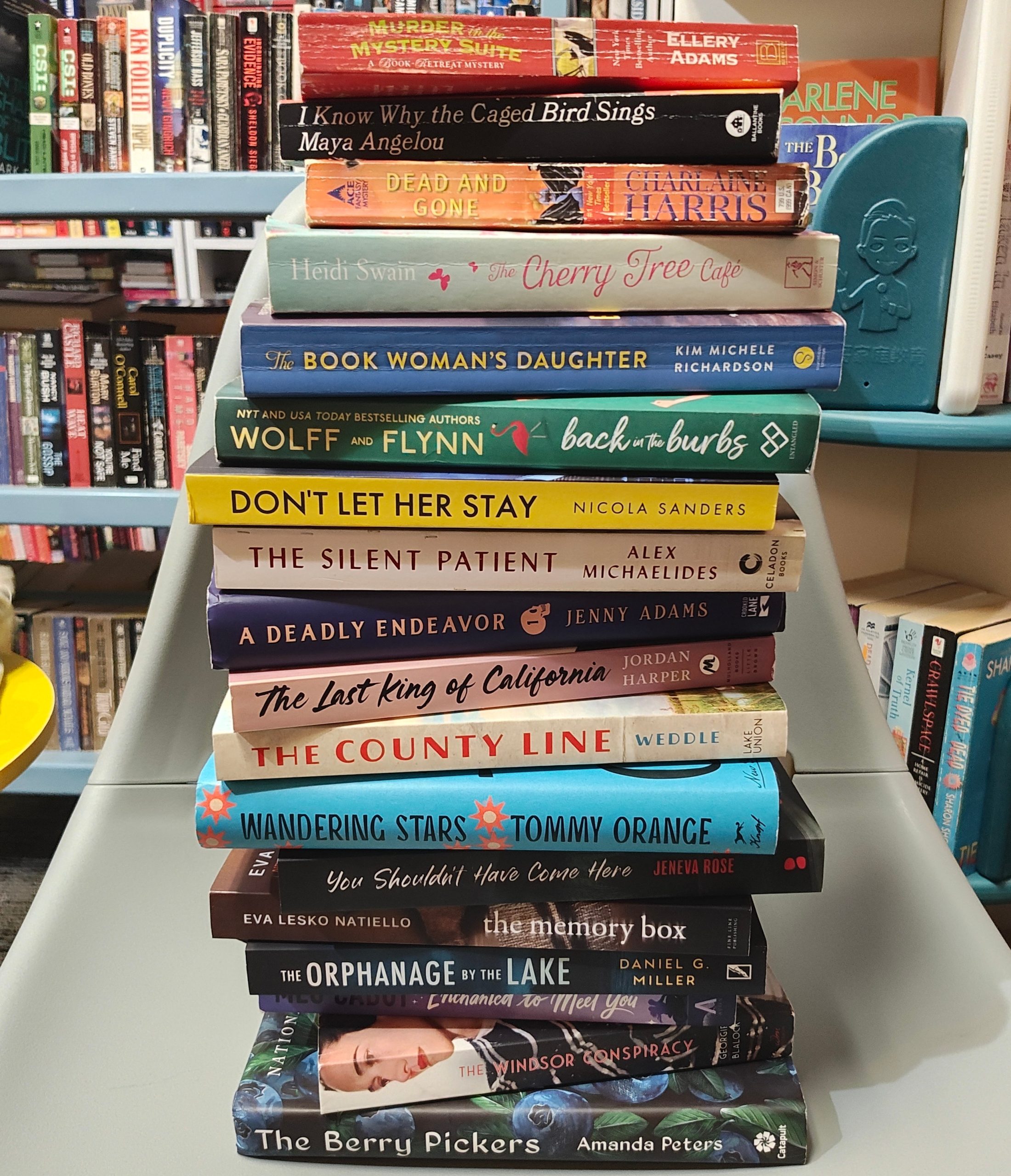 Christiana read Murder in the Mystery Suite by Ellery Adams, I Know Why the Caged Bird Sings by Maya Angelou, Dead and Gone by Charlaine Harris, Cherry Tree Cafe by Heidi Swain, The Book Woman’s Daughter by Kim Michelle Richardson, Back in the Burbs by Tracy Wolff and Avery Flynn, The Silent Patient by Alex Michaelides, and Don’t Let her Stay by Nicola Sanders.