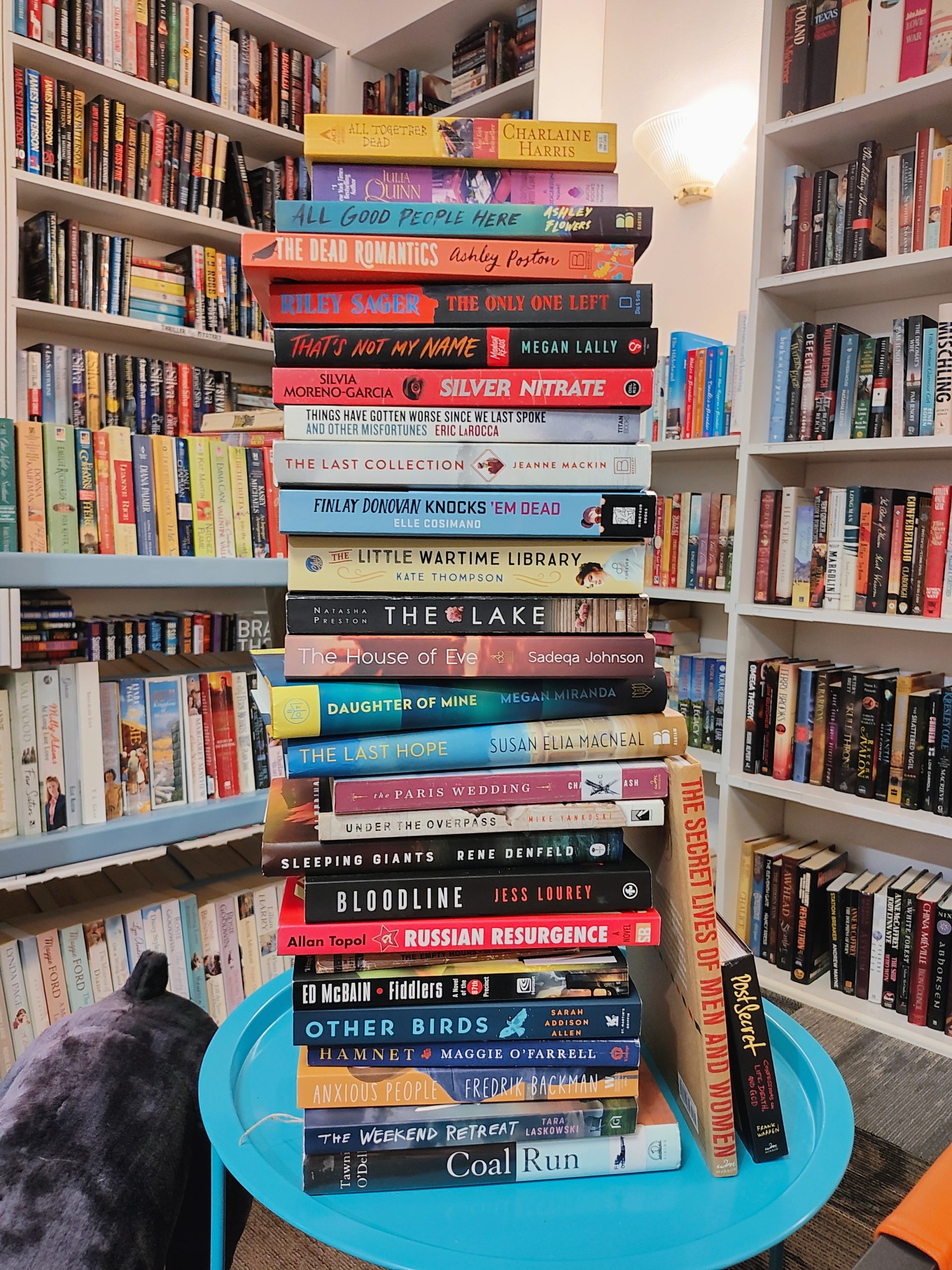 Shana outdid us all with The House of Eve by Sedeqa Johnson, The Little Wartime LIbrary by Kate Johnson, Finlay Donovan Knocks ’em Dead by Elle Cosimano, The Last Collection by Jeanne Mackin, The Last Hope by Susan Elia MacNeal, Daughter of Mine by Megan Miranda, and To Sir Philip with Love by Julia Quinn.