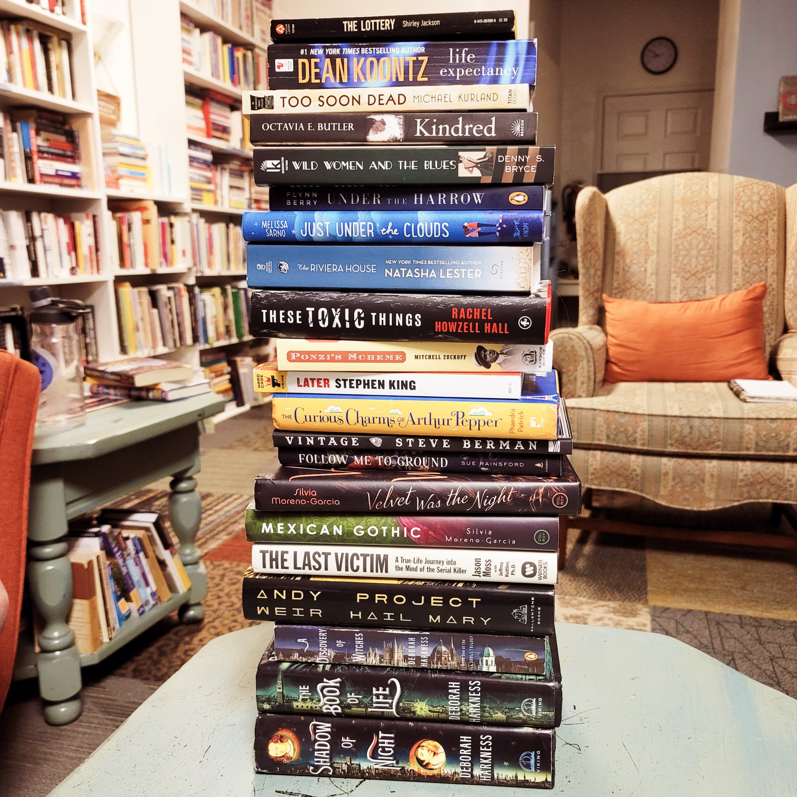 I read the first of Shana’s Discovery of Witches series which Mariya is borrowing. Shana is borrowing Under the Harrow by Flynn Berry. Hugh is borrowing Kindred by Octavia Buthler and I’m so glad because it was such an unusual book. Ross is borrowing The Lottery by Shirley Jackson (already in her freezer.) Hopefully the “DTYA” Just under the Clouds by Melissa Sarno will pick her up from demons and serial killers.
